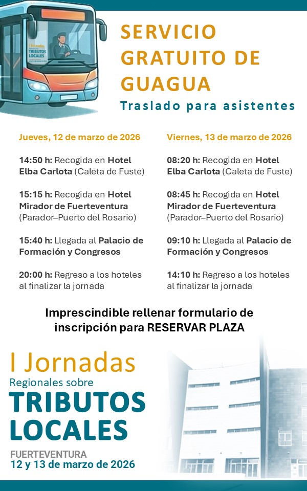 Con el fin de facilitar la asistencia a las jornadas, la organización pone a disposición un servicio gratuito de guagua desde los hoteles Elba Carlota (Caleta de Fuste) y Mirador de Fuerteventura (Parador–Playa Blanca) hasta el Palacio de Formación y Congresos de Fuerteventura, tanto de ida como de vuelta.
