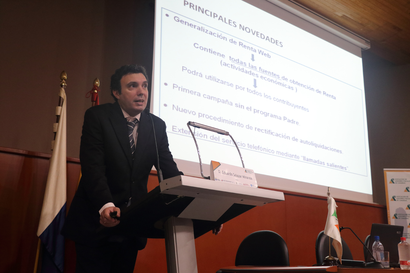 Eduardo Salazar Miranda, Administrador de la Agencia Tributaria de San Bartolomé de Tirajana del Cuerpo Técnico de Hacienda del Estado. Profesor del IRPF y de Obligaciones formales en el Experto en Asesoría Fiscal de la ULPGC con su ponencia «Confección de la Renta 2016″ expuso las novedades en la presentación de la obligaciones tributarias a través de la Sede Electrónica de la AEAT (Renta WEB), destacando la novedad de que ésta es la primera campaña sin el programa Padre, se presentan nuevos procedimientos de rectificación de autoliquidaciones, cambios en el servicio telefónico mediante «llamadas salientes» de la AEAT, entre otros, y finalizando con el tratamiento fiscal de las cantidades percibidas por la Cláusula Suelo.