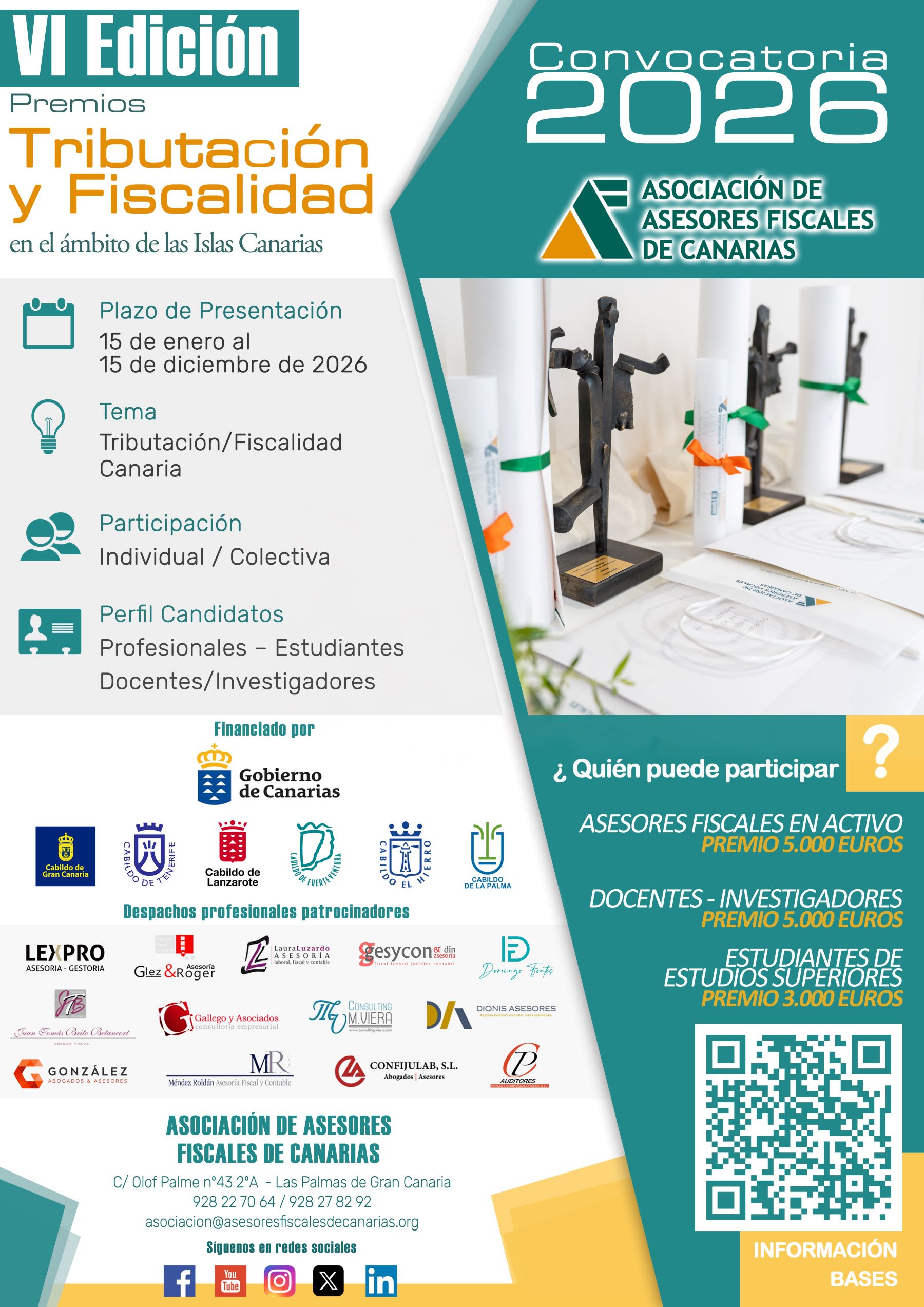 Para consultar las bases completas e inscribirse, los interesados pueden visitar la página web oficial de la asociación: VI EDICIÓN PREMIOS AFC https://asesoresfiscalesdecanarias.org/premios-afc-2026/